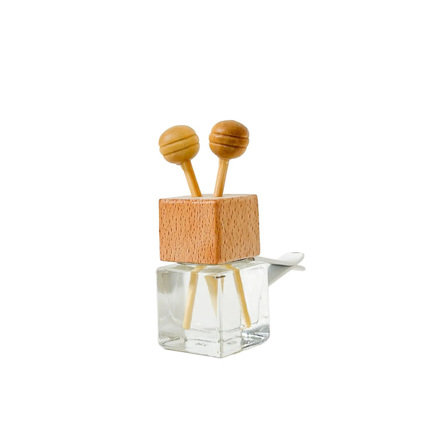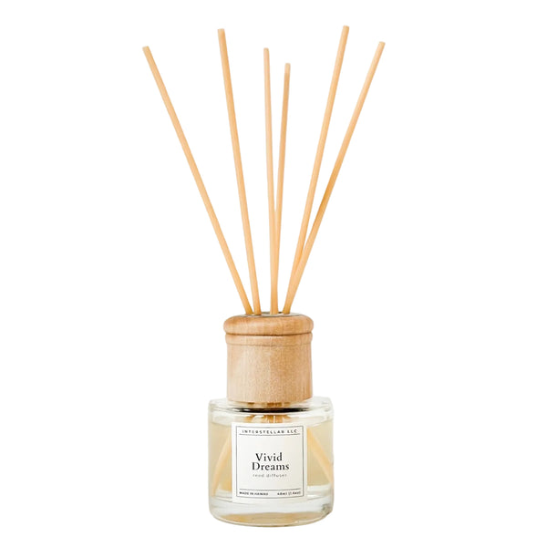 Candle labeled 'Vivid Dreams' with a wooden lid on a white background