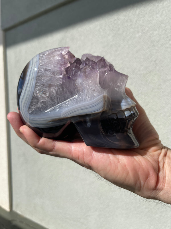 Banded Agate Amethyst 3.75" Geode SKULL Carving #S9
