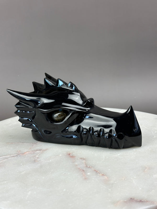 Black Obsidian Dragon 6" Skull Carving with Labradorite eyes #D1