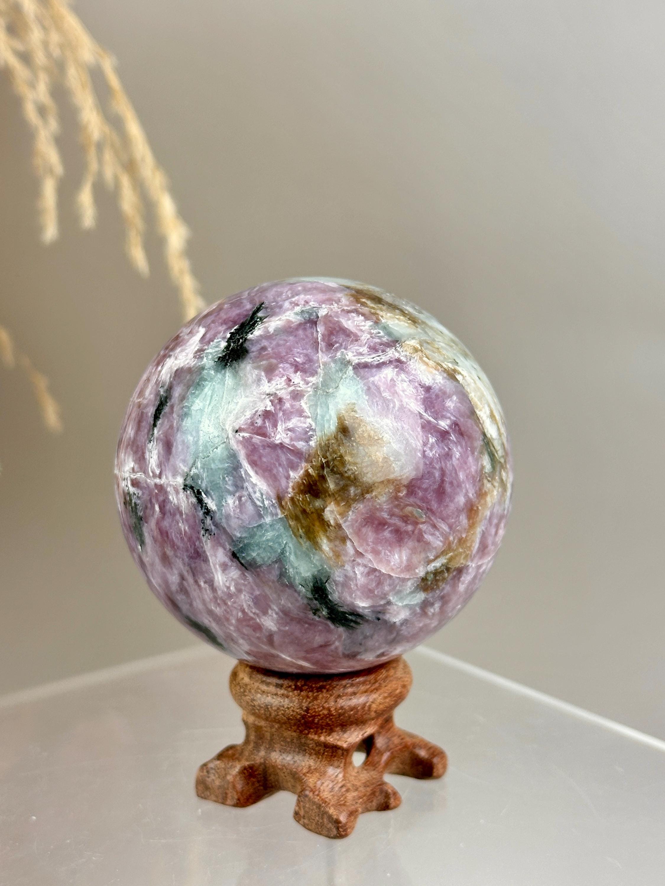 Elevate your collection with this exceptionally rare Pink Charoite sphere, shimmering with dynamic inclusions of Blue Calcite, Aegirine, and golden Tinaksite. At 61mm (2.4β), this breathtaking sphere from Russia is a showstopping piece, perfect for crystal connoisseurs, healers, and lovers of high-vibration stones.