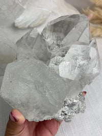 Brazilian high vibrational Garden Lemurian cluster. Self-standing, great clarity, striations, penetrating crystals, rainbow inclusions.