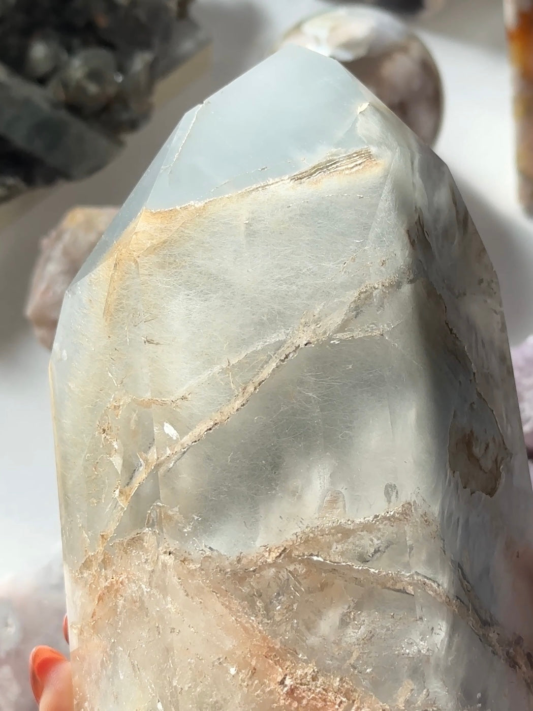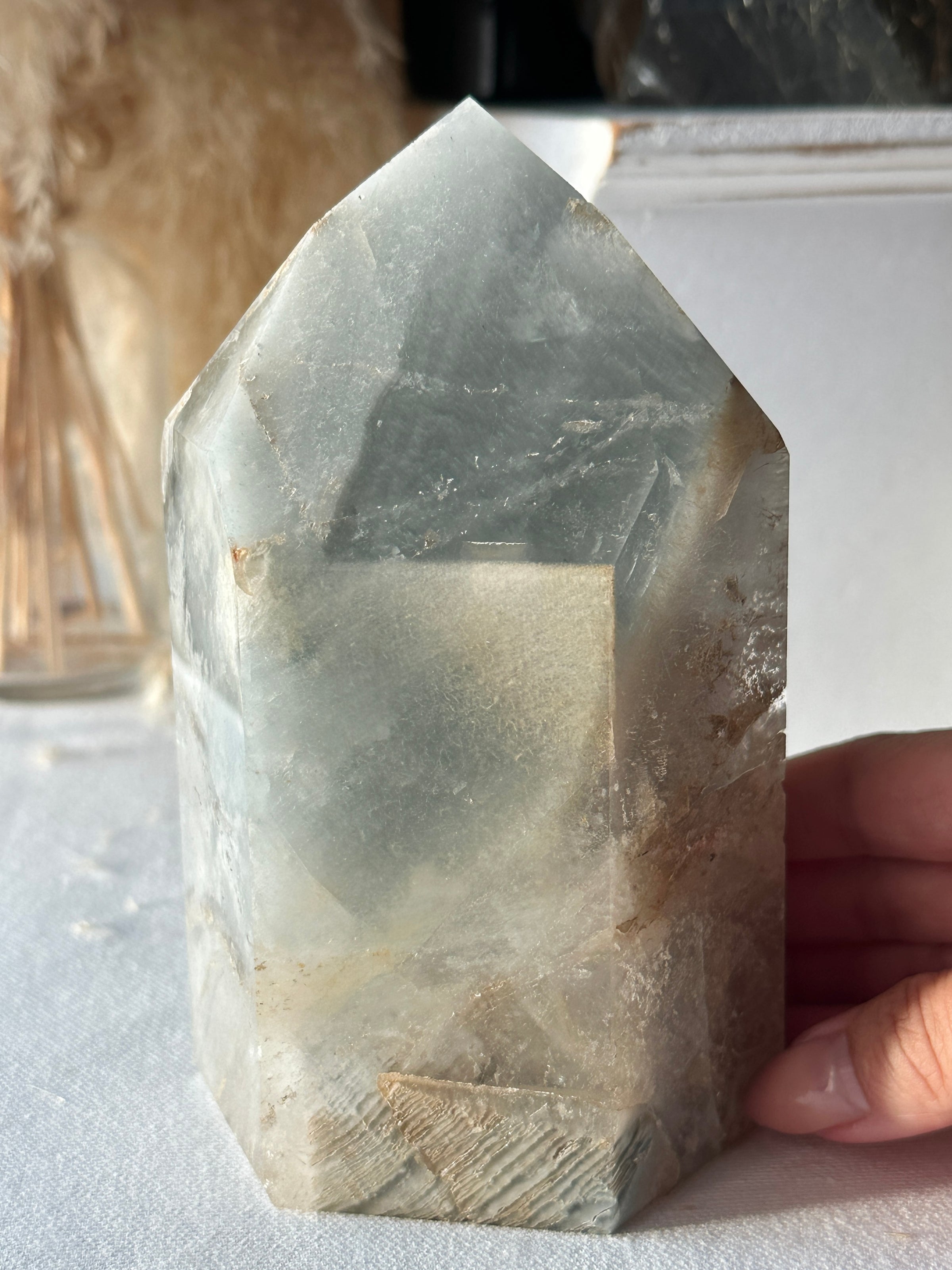 Make a bold energetic statement with this captivating Blue Amphibole Tower from Brazil. Standing at 5.75” tall, 3.5” wide, 2.5” thickness, and weighing 2.7 lbs, this substantial piece features dreamy shades of soft blue, white, and grey with feathery inclusions that give it a celestial, cloud-like appearance. Known for its calming and spiritually uplifting energy, blue amphibole is said to enhance intuition, inner peace, and connection to higher realms. A perfect centerpiece for your sacred space, meditation altar, or crystal collection.
