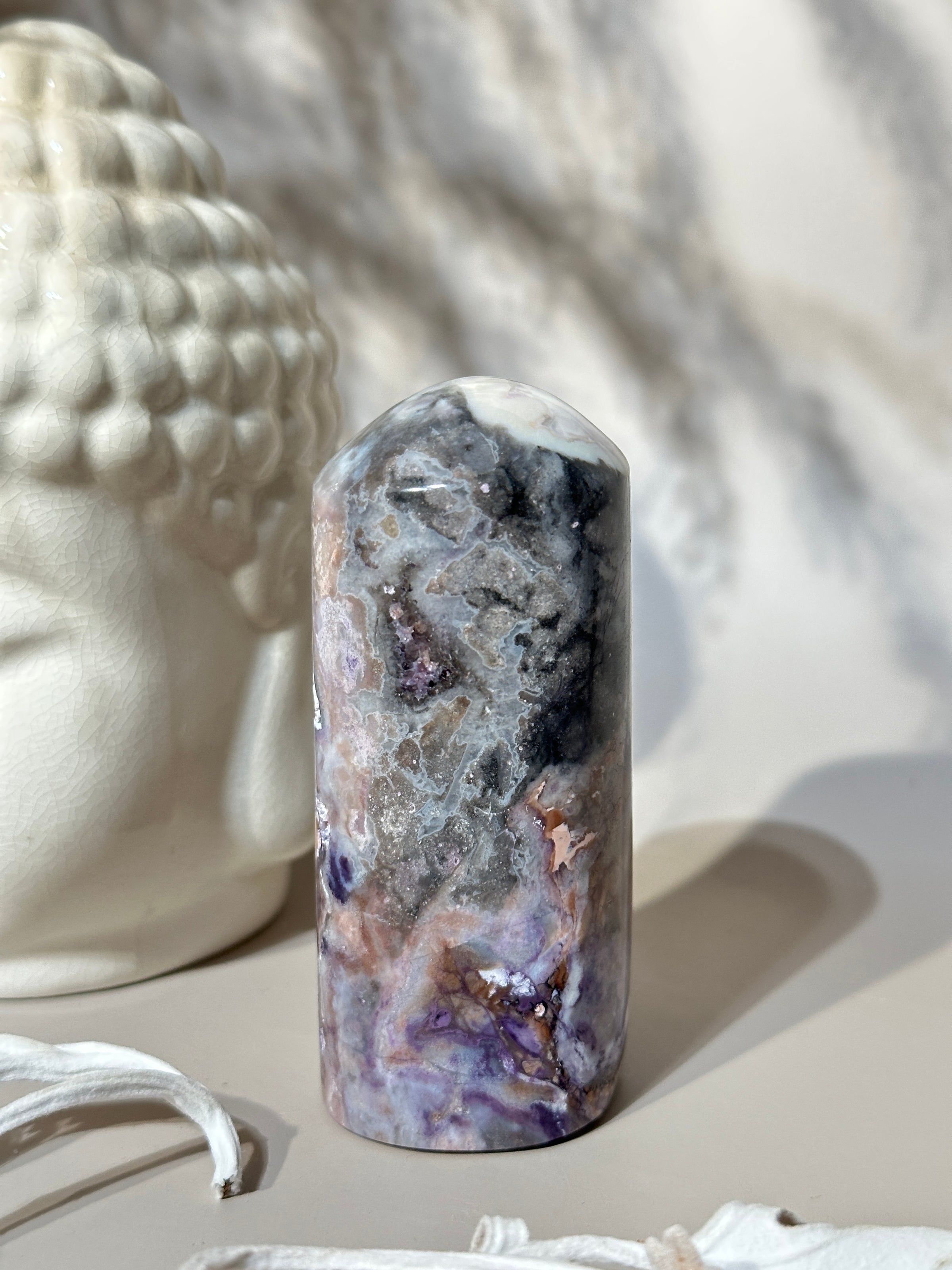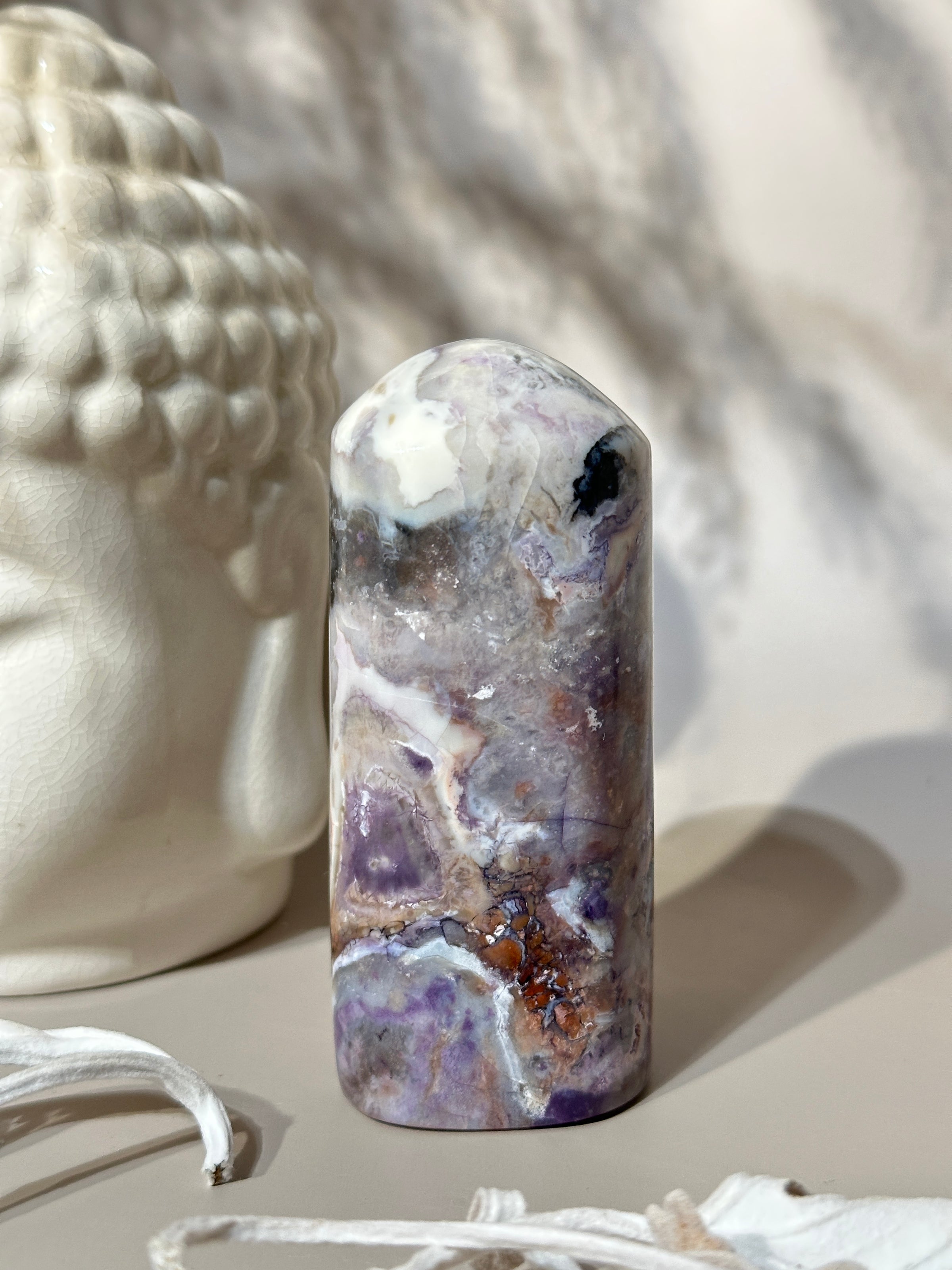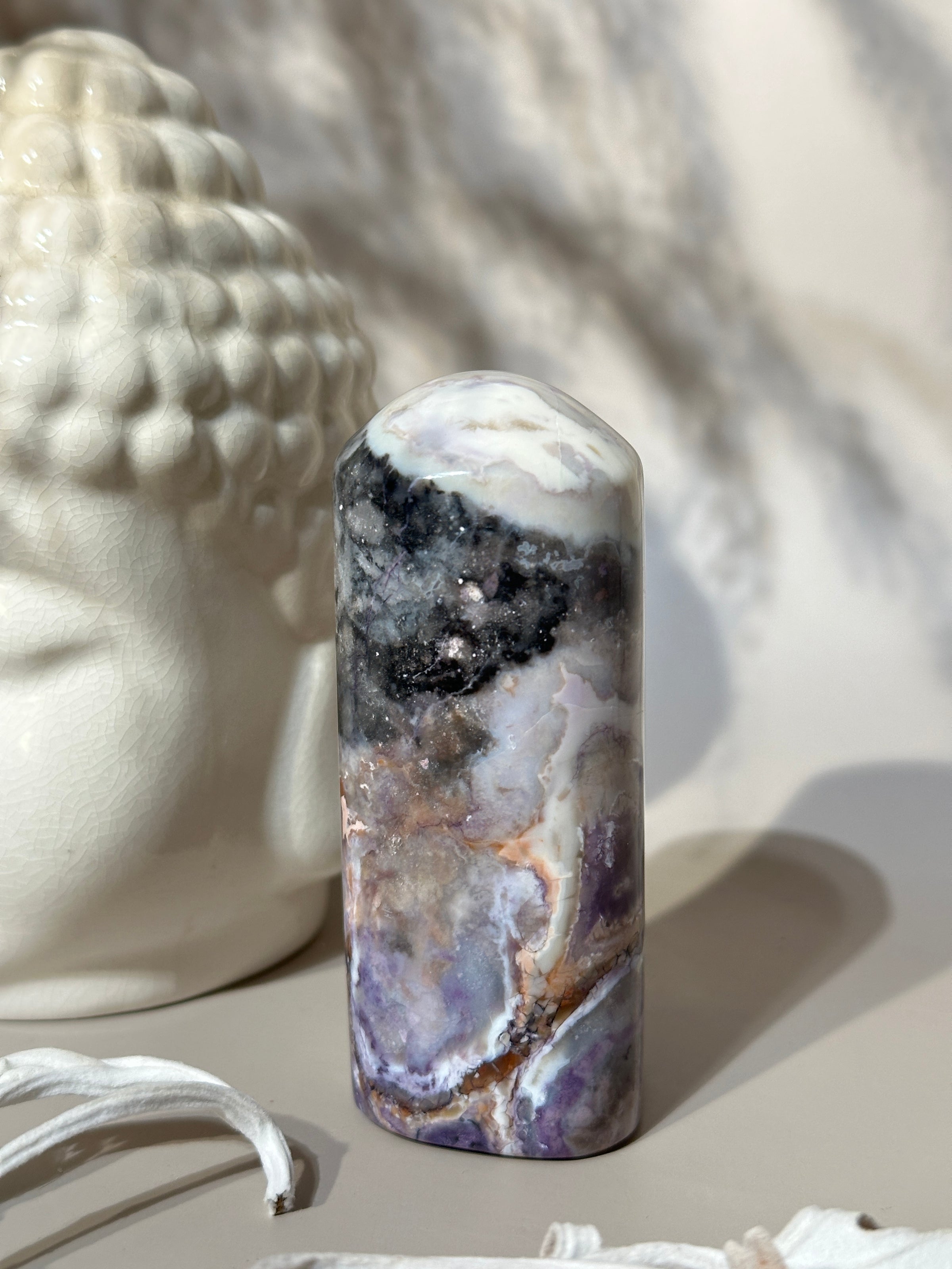 This mesmerizing Tiffany Stone from Utah is a natural work of art, displaying a dreamy blend of creamy peach pink, soft lavender, eggshell white, and hints of cosmic gray. Its marbled tones and smooth finish make it a standout piece for collectors and crystal lovers alike.